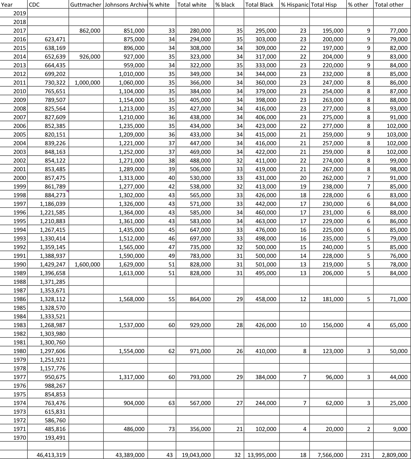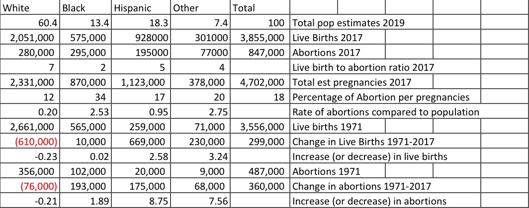 I found another source – the Johnston’s Archive: Data on Abortion by Race This Data is compiled by a research scientist whose education is in astrophysics. What better person to put together data than a research scientist! You can go to his site www.johnstonsarchive.net for a wealth of data related to abortion statistics.